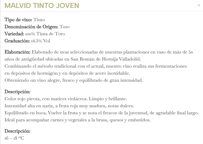 Elaborado de uvas seleccionadas de nuestras plantaciones en vaso de más de 50 años de antigüedad ubicados en San Román de Hornija Valladolid.